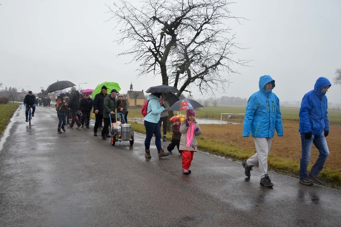 V 10 hodin jsme se sešli stejně jako loni u píseckého hřbitova a vydali se vstříc společnému setkání. Vzhledem k počasí jsme se posilnili již na začátku, v nabídce byl svařák, čaj s punčem a čaj, k tomu měnická vánočka. Druhá zastávka byla u mostu přes Bystřici. Nechybělo ani první společné foto. Postupně přestalo pršet. Po sousedském setkání na křižovatce v lese jsme se společně vydali do Luhů. Letošní polévku zajistila obec Mlékosrby a na výborné gulášovce s čerstvými rohlíky jsme si snad všichni pochutnali. Společná fotka v Luhách již byla bez deště...